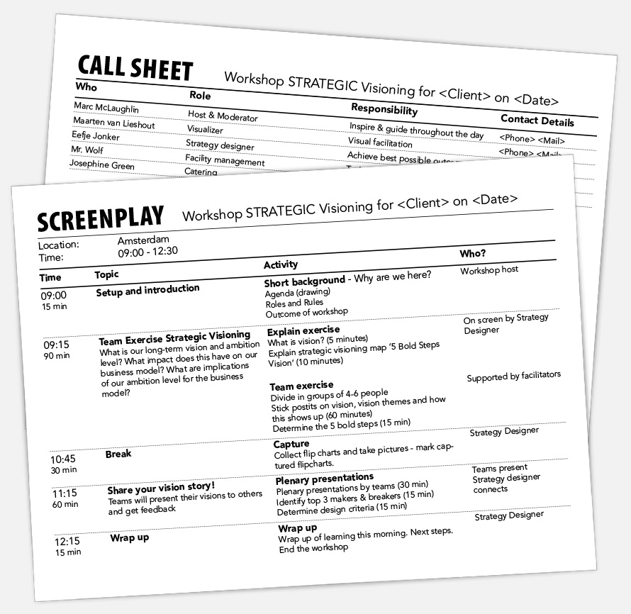 Just like it is in movie-making, a screenplay provides an efficient and effective way to design a meeting. The more thorough the screenplay, the better the meeting.